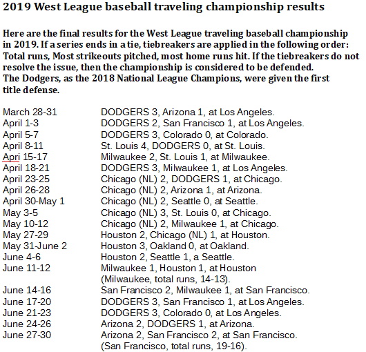 The Dodgers, who won the National League pennant in 2018, were the best team in the West that year, and were thus given the first West League lineal championship for safe keeping. They kept it just safe enough to squeeze by the Chicago Cubs for the 2019 title.