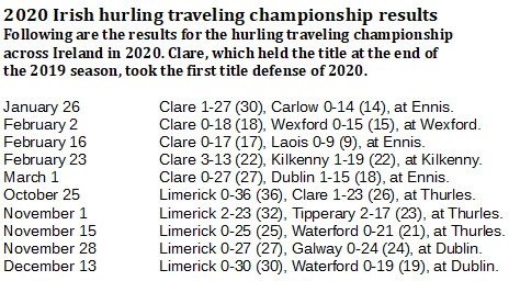 Play reconvened in late October with the Munster County playoff duel between Clare and Limerick doubling as National Hurling League championship game on Oct. 25. Limerick won, then proceeded to win all the way through the county championship and the national final in December against Waterford.